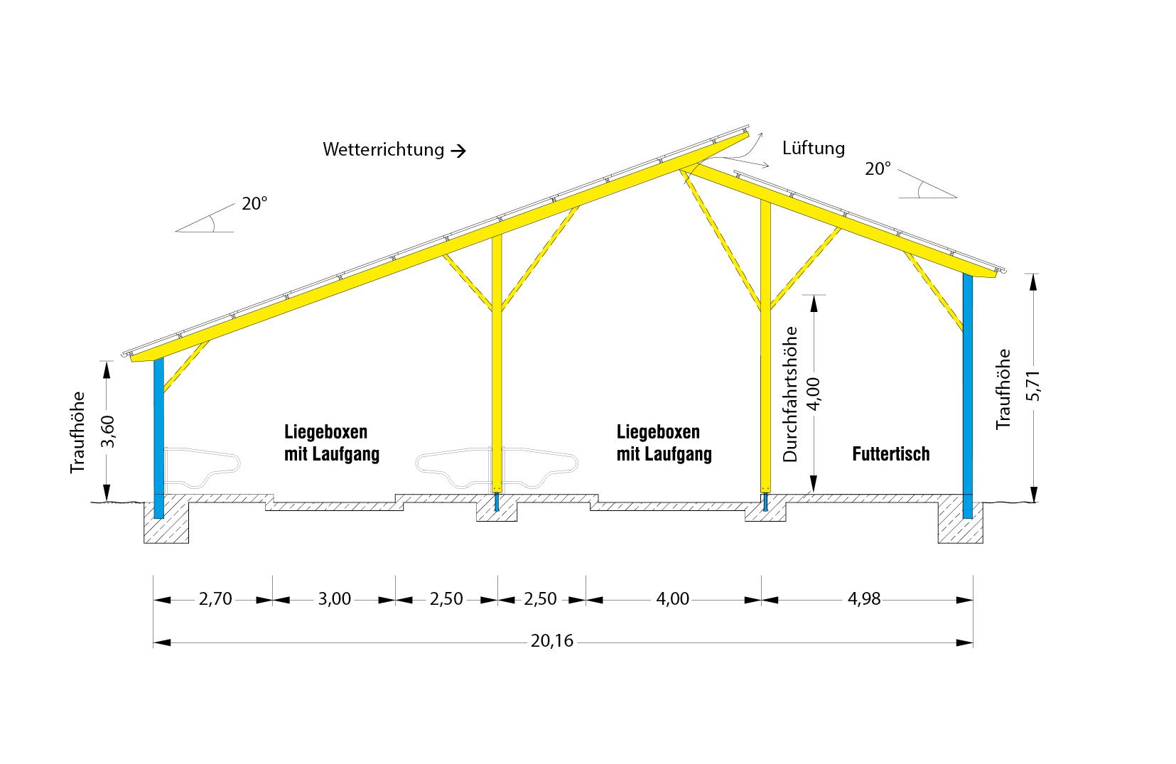 Die Spannweiten reichen – je nach Bauart – von ca. 9 m bei kleineren Außenklimaställen bis über 30 m bei großen freitragenden Lösungen. Traufhöhen und Dachneigungen lassen sich variabel anpassen, sodass der Stall optimal zu Herdengröße und Betriebsstruktur passt.
