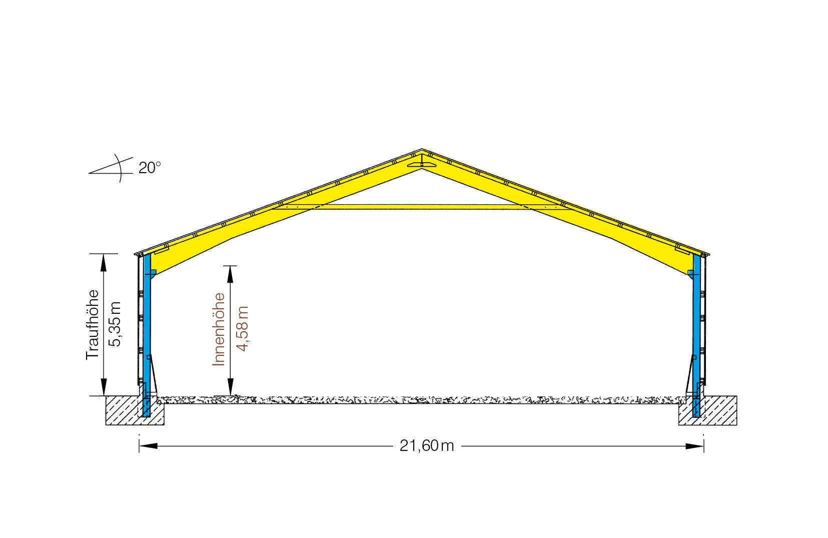 Die Bewegungshalle Typ RBs setzt auf Rahmenbinder. Dadurch entsteht im Firstbereich besonders viel Höhe und ein großzügiges Raumvolumen. Diese Bauweise sorgt für optimale Belichtung und ein luftiges Raumklima, das sich positiv auf Pferde und Training auswirkt.
