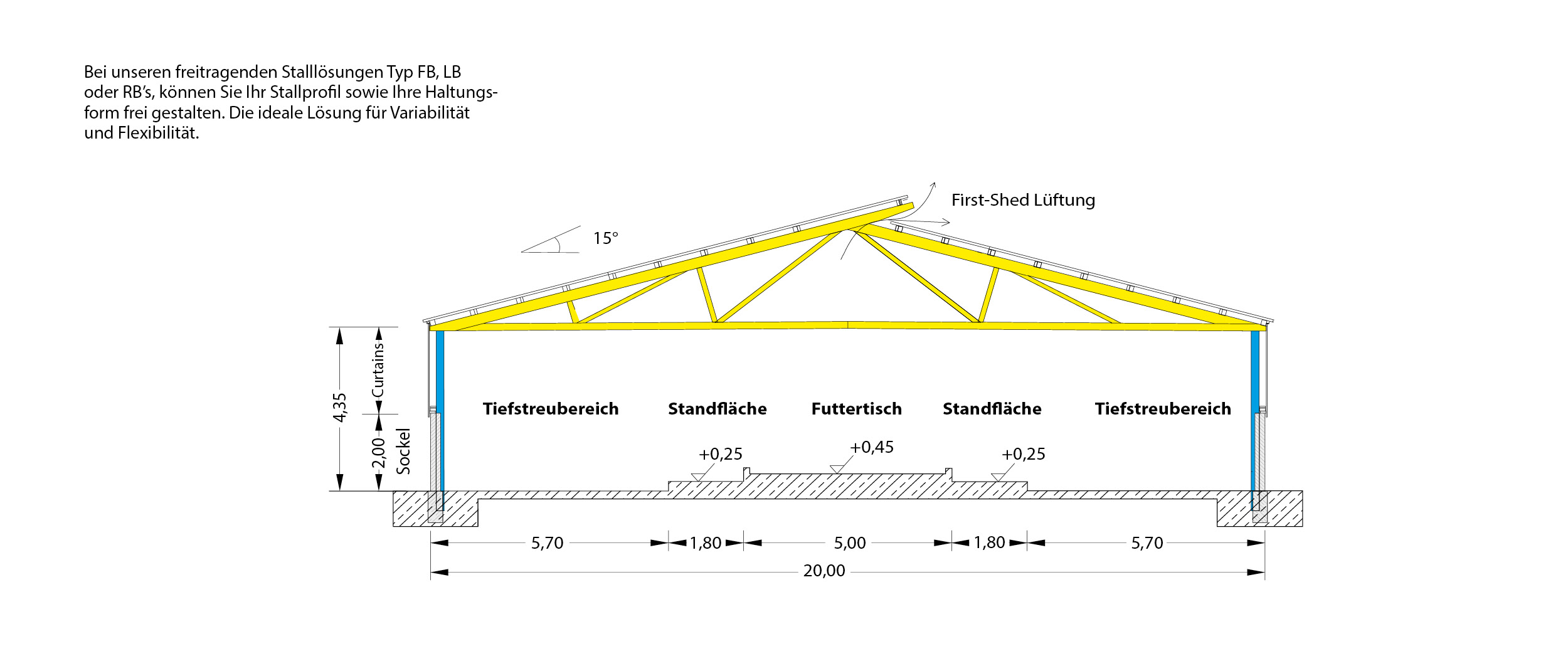 Mit unterschiedlichen Dachneigungen (15°, 20° oder 25°) passt sich der Typ RB optimal an betriebliche Gegebenheiten an. Durch die freitragende Konstruktion sind individuelle Stallprofile und Erweiterungen jederzeit möglich.