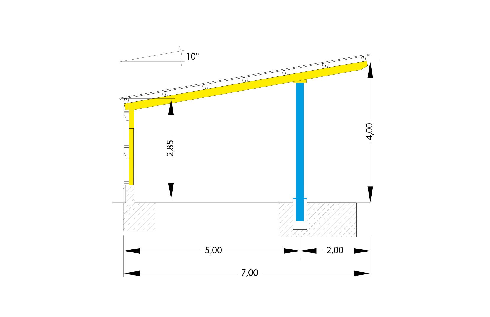 Vollholzbinder, zurückgesetzte feuerverzinkte Stahleinspannstütze, Verkleidung mit Holz, Trapezblech oder Wellfaserzementplatten
