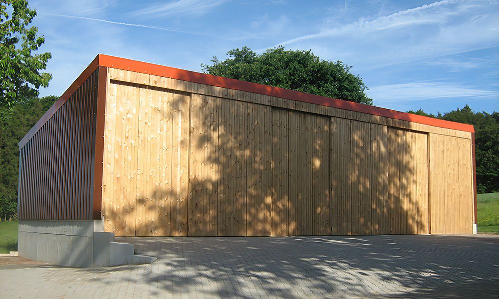 Neben verschiedenen Toranlagen (Schiebe- oder Sektionaltore) können Maschinenschuppen mit Kraggiebeln, Sockelerhöhungen oder geschlossenen Rückwänden ausgeführt werden. Auch Varianten mit integrierter Werkstatt oder als Schüttguthalle sind realisierbar.