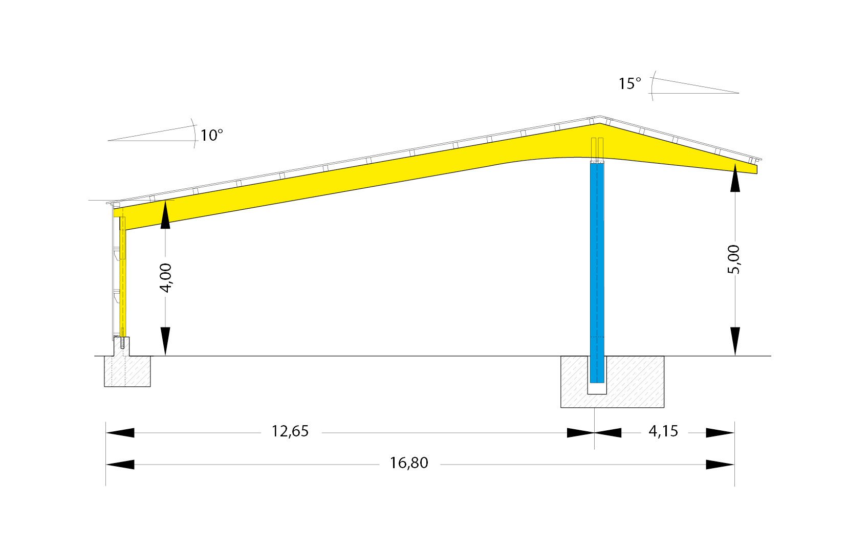Leimbinder, zurückgesetzte feuerverzinkte Stahleinspannstütze, Verkleidung mit Holz, Trapezblech oder Wellfaserzementplatten