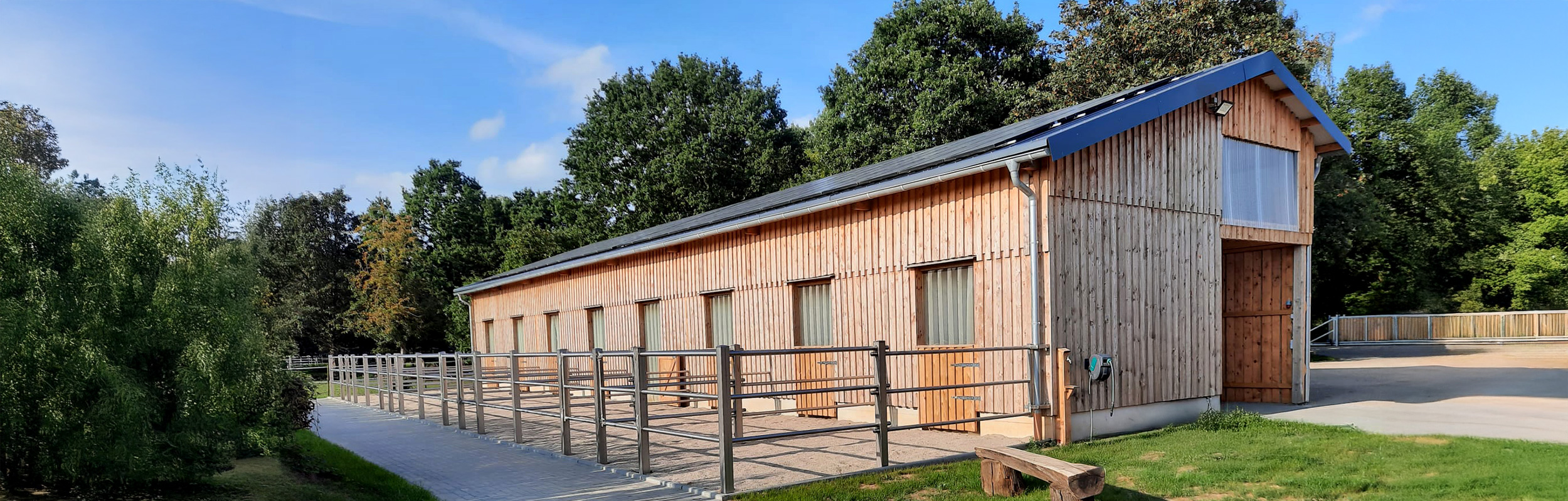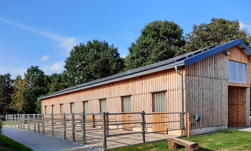 Unter dem Vordach lassen sich bauseits Paddockflächen einrichten, die durch die Stützen einfach umzäunt werden können.