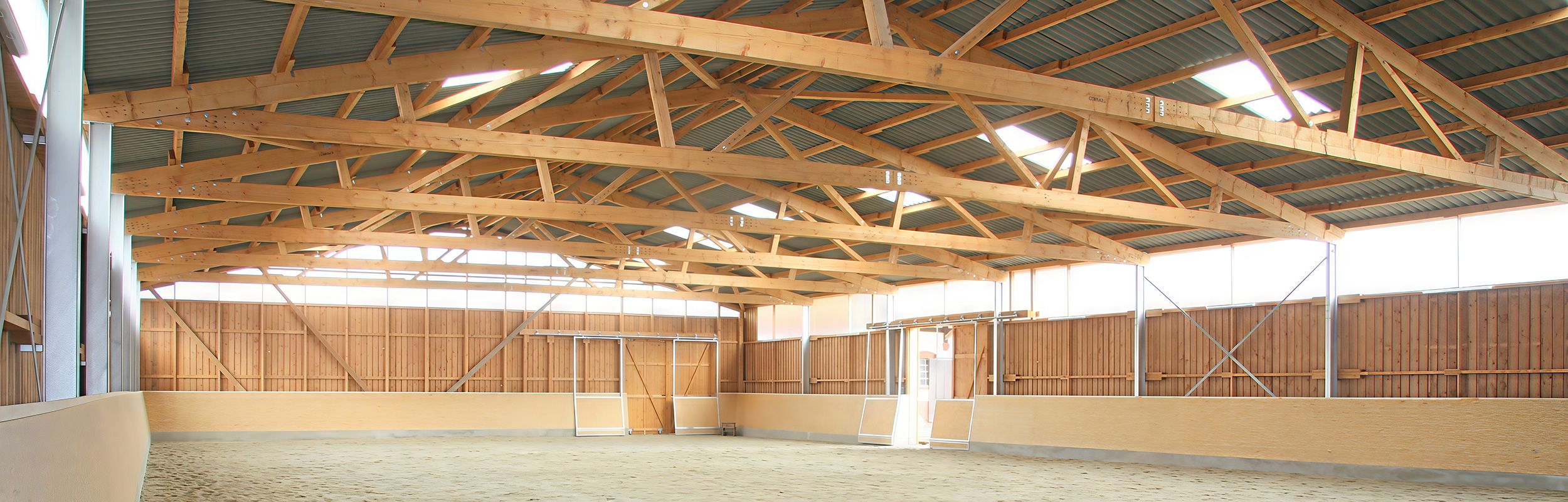 Unsere Reithallen bestehen aus hochwertigen Leim- oder Fachwerkbindern aus Eifel-Holz, kombiniert mit feuerverzinkten Stahlstützen. Durch unsere eigene Fertigung sichern wir höchste Präzision, Langlebigkeit und Wirtschaftlichkeit – von der Planung bis zur fertigen Montage.
