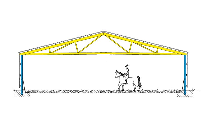 Reithallen sind auf das standardisierte Hufschlagmaß von 20 × 40 m ausgelegt. Zur Auswahl stehen Raster mit 8 Feldern à 5,125 m oder 6,25 m. Bei der größeren Ausführung entsteht zusätzlich Platz für einen Besuchergang.